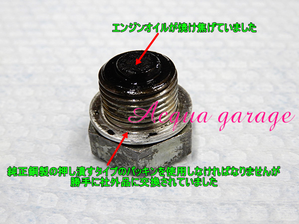 エンジンオイルは、焼け焦げた状態でドレンプラグの先端も焼け焦げていました
