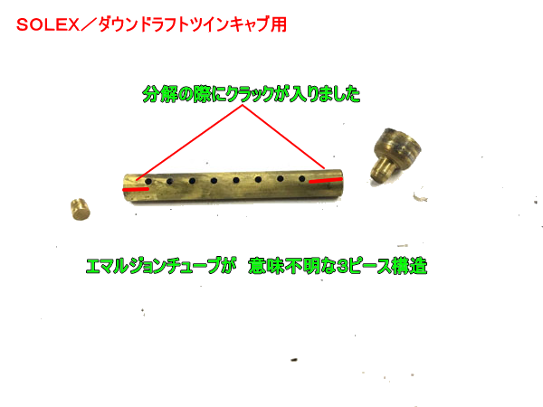 キャブの本体からエマルジョンチューブ? を、抜き取ると上記画像の様にクラックが入りました